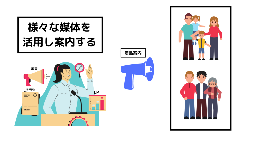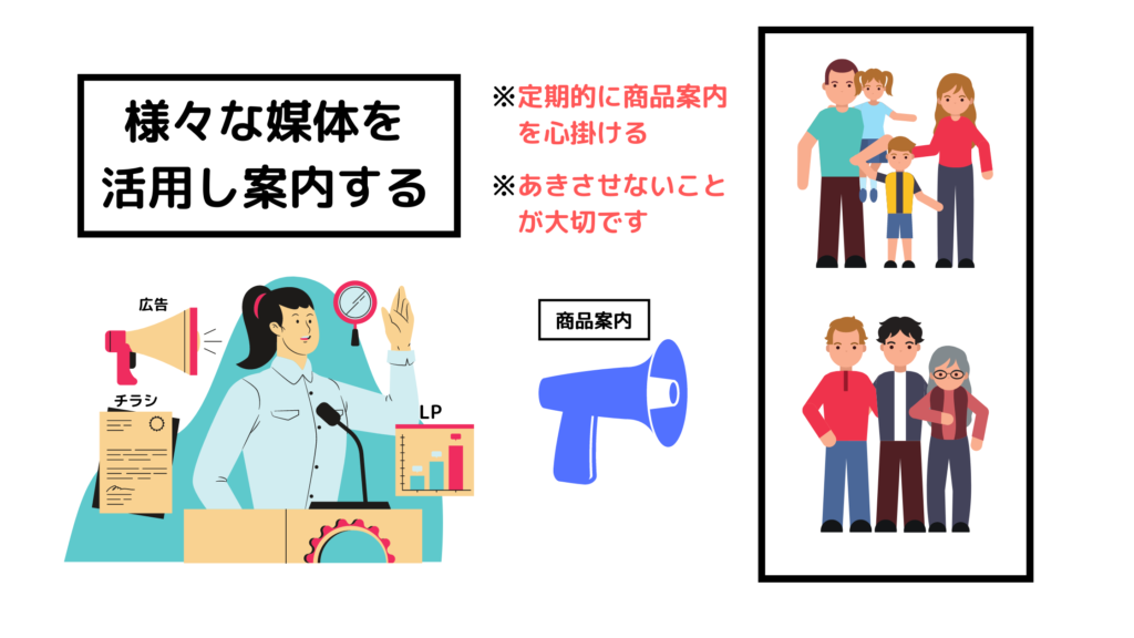 関係性を築けた方々に向けて、LP(ランディングページ)・チラシ・広告などを活用し、商品を案内するようにします。